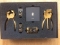 4 delige geschenkdoos met een sigarenknipper een ontnieter en een zware "press paper" vervaardigd uit staal en afgewerkt in koper en nikkel, daarna 23krt. verguld. inclusief 3 doosjes nietjes.